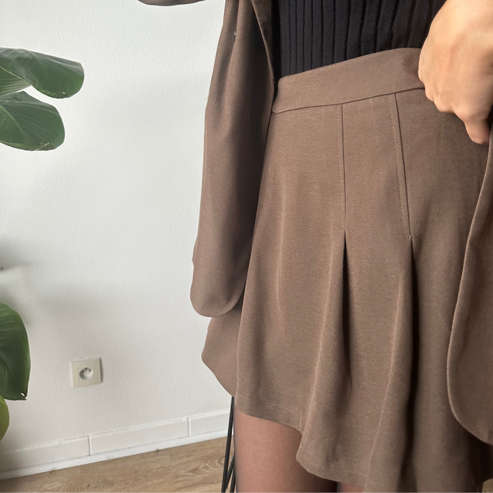 Jupe courte plissée. La jupe possède une doublure short avec fermeture par zip sur le coté.