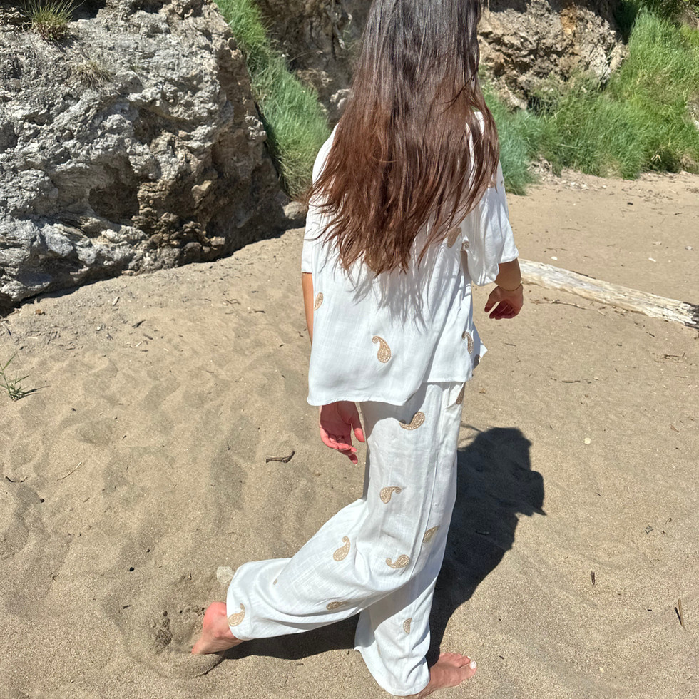 Pantalon avec doublure pour un look tendance décontracté. Pantalon long, fluide. Pour le look complet, l’associer à la chemise coquillage.