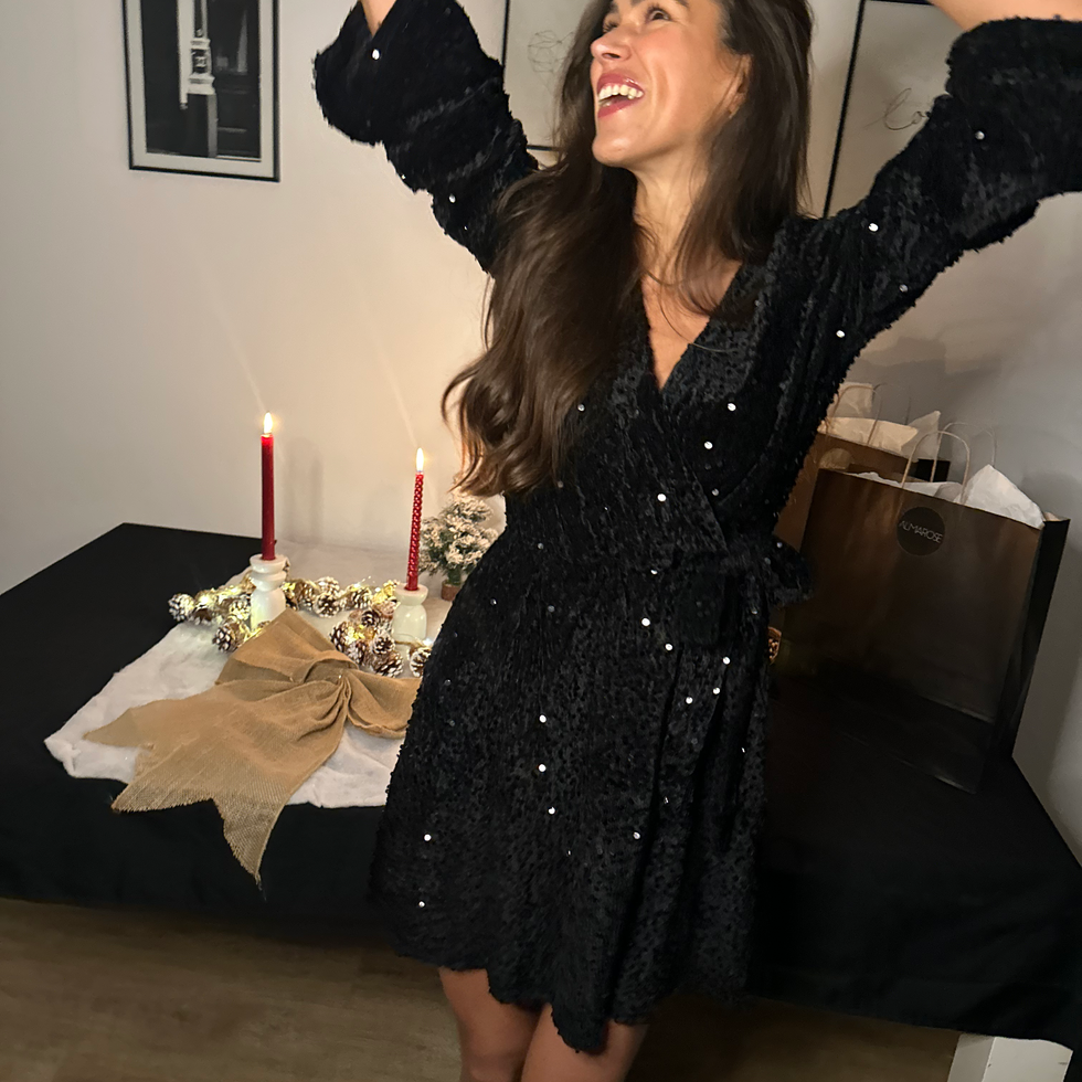 Robe à sequins chic et élégante, la pièce parfaite pour les fêtes. Robe avec décolleté, et fermeture à la taille avec la ceinture intégrée. Effet velours.
